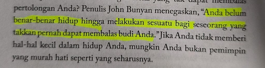 Hari ini saya membaca buku The 21 Indispensable Qualities of A Leader karya John C. Maxwell, beliau berbicara mengenai sifat pemimpin, Kemurahan Hati.